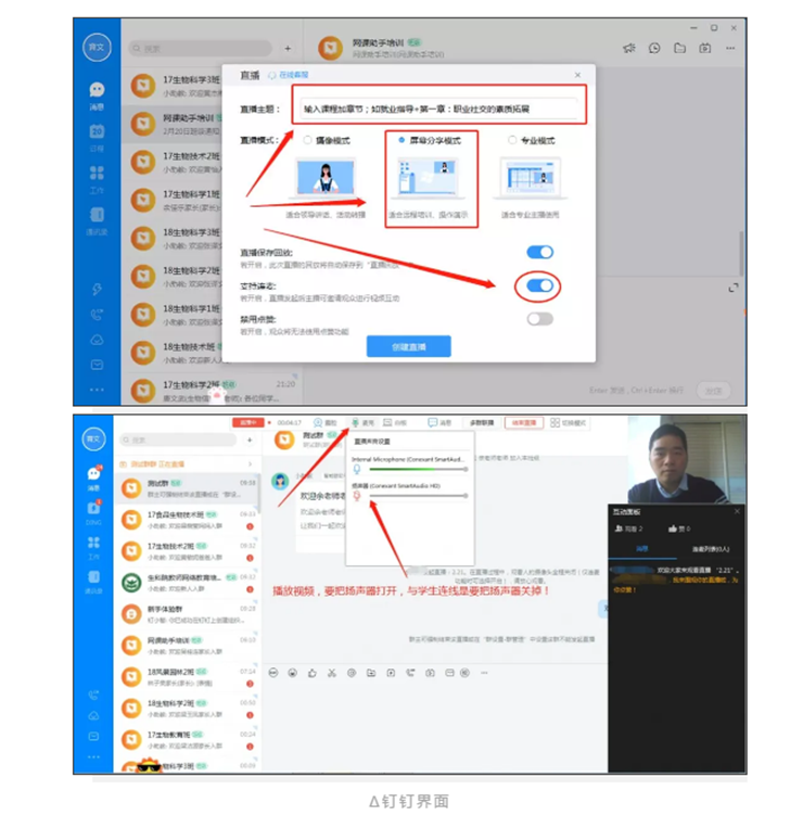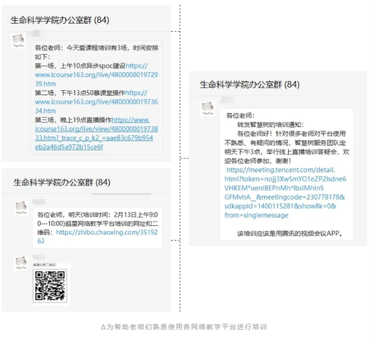 其中,雨课堂、超星、智慧树等三个直播平台,是学校教务处组织的。之所以补充“钉钉”这个平台,是生科院党政班子在调研分析中,发现“钉钉”直播教学也比较符合生命科学课程的教学需求。