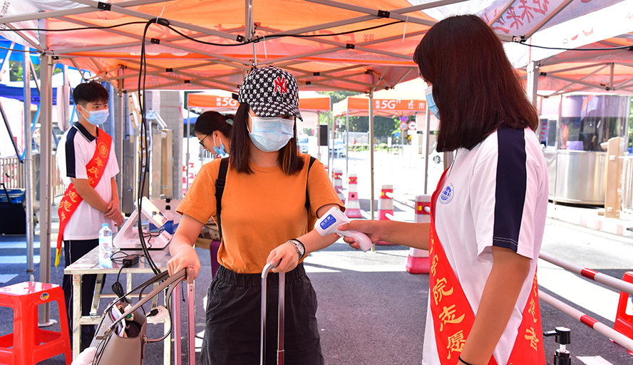 在主校区主校门的报到现场,学工处、保卫处工作人员与来自团委和二级学院的学生志愿者积极协助新生报到,在校门口有序疏导交通,引导学生进入校门完成身份核验与体温检测后,到达二级学院的报到点办理报到手续。报到手续完成后,志愿者帮助新生搬运行李,并引导专升本新生进入宿舍,各宿舍区宿管员同样在宿舍入口处做好接待工作。