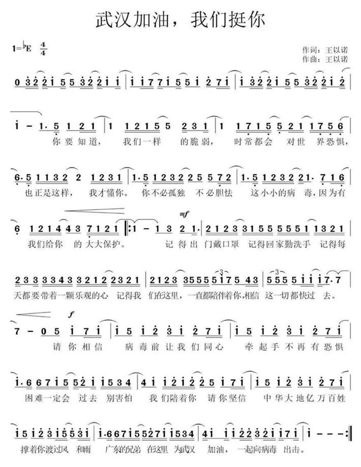 音乐学院积极响应国家的号召,充分发动师生为打赢疫情防控阻击战贡献力量。其中,该院2016级音乐表演专业王以诺同学深为抗疫志士的大爱之举所震撼,作词作曲《武汉加油,我们挺你!》,把力量融进歌里,以音乐的形式为武汉加油!祝愿武汉早日战胜疫情。