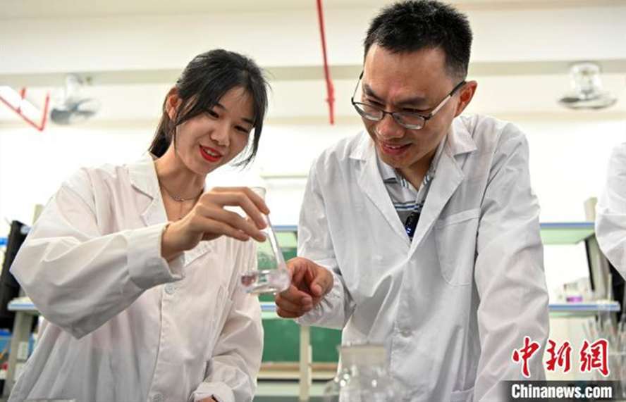 今年6月底,台湾教师黄崇辅(右)在yl23455永利官网指导学生做实验。中新社记者 陈骥旻 摄